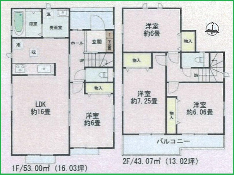 | 間取内容 | LDK16畳 1階 1室 洋室6畳 1階 1室 洋室6畳 2階 1室 洋室6.06畳 2階 1室 洋室7.25畳 2階 1室 | ||