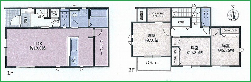 | 間取内容 | LDK18畳 1階 1室 洋室5.25畳 2階 2室 洋室7畳 2階 1室 | ||