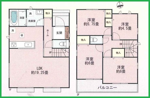 | 間取内容 | LDK19.25畳 1階 1室 洋室4.5畳 2階 1室 洋室5.75畳 2階 1室 洋室6畳 2階 2室 | ||