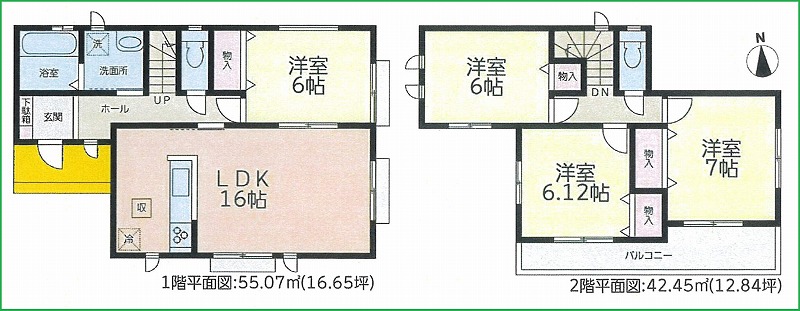 | 間取内容 | LDK16畳 1階 1室 洋室6畳 1階 1室 洋室6畳 2階 1室 洋室6.12畳 2階 1室 洋室7畳 2階 1室 | ||