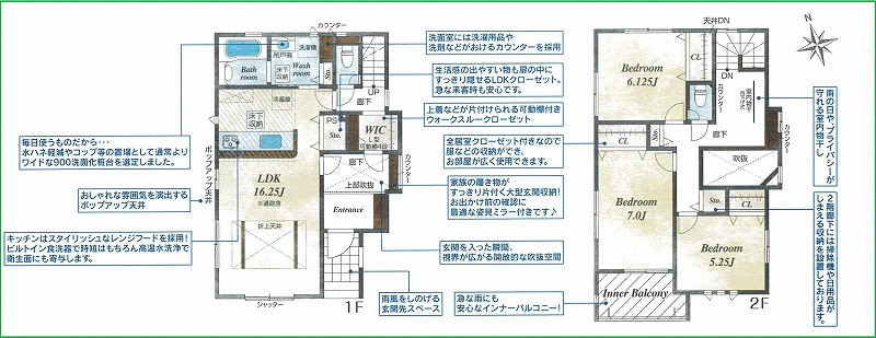 | 間取内容 | LDK16.25畳 1階 1室 洋室5.25畳 2階 1室 洋室6.125畳 2階 1室 洋室7畳 2階 1室 | ||