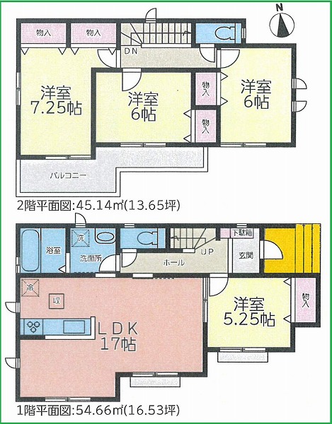 | 間取内容 | LDK17畳 1階 1室 洋室5.25畳 1階 1室 洋室6畳 2階 2室 洋室7.25畳 2階 1室 | ||