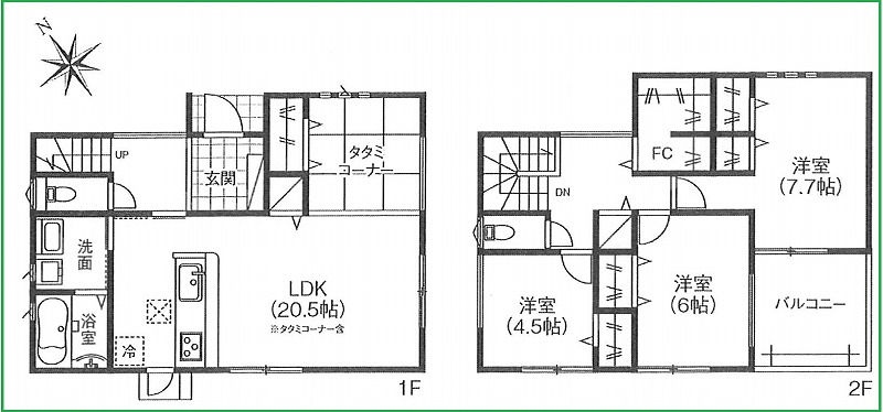 | 間取内容 | LDK20.5畳 1階 1室 洋室4.5畳 2階 1室 洋室6畳 2階 1室 洋室7.7畳 2階 1室 | ||