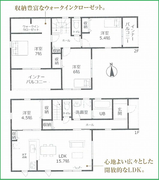 | 間取内容 | LDK15.7畳 1階 1室 洋室4.5畳 1階 1室 洋室5.4畳 2階 1室 洋室6畳 2階 1室 洋室7畳 2階 1室 | ||