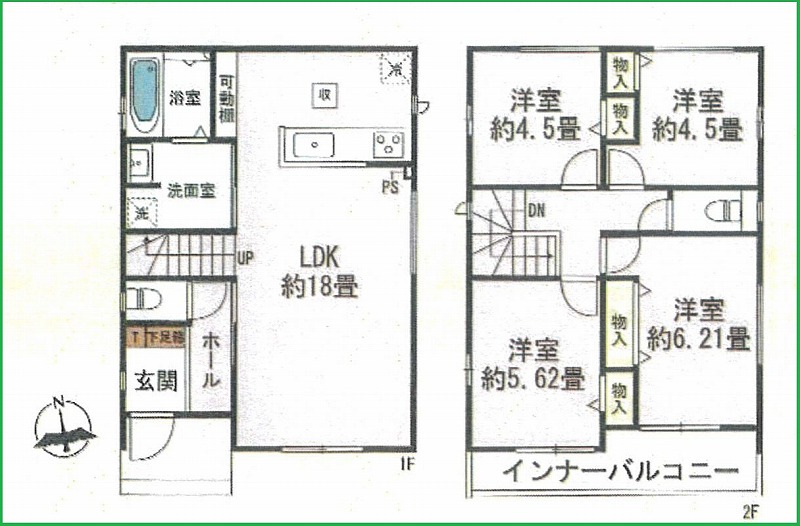 | 間取内容 | LDK18畳 1階 1室 洋室4.5畳 2階 2室 洋室5.62畳 2階 1室 DK6.21畳 2階 1室 | ||