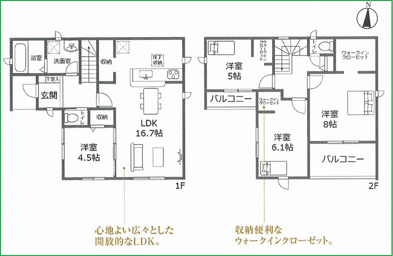 | 間取内容 | LDK16.7畳 1階 1室 洋室4.5畳 1階 1室 洋室5畳 2階 1室 洋室6.1畳 2階 1室 洋室8畳 2階 1室 | ||