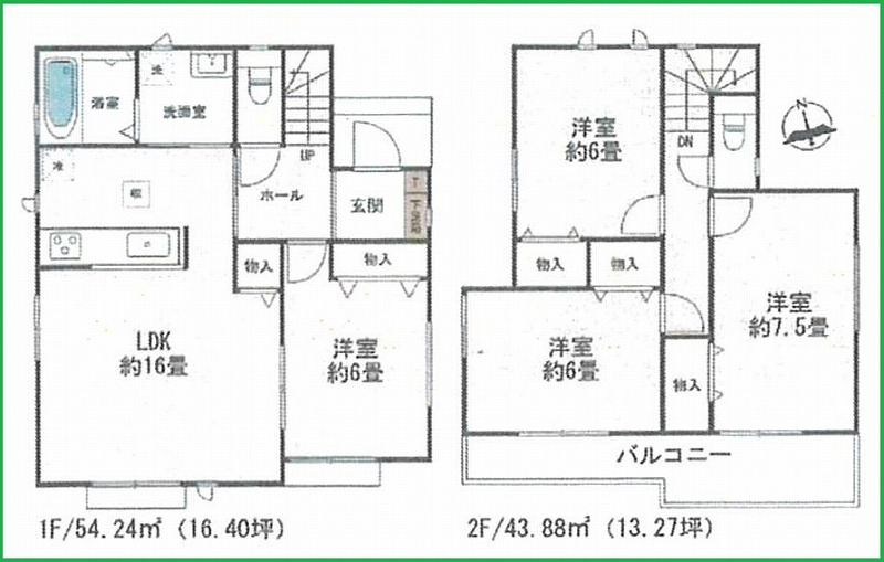 | 間取内容 | LDK16畳 1階 1室 洋室6畳 1階 1室 洋室6畳 2階 2室 洋室7.5畳 2階 1室 | ||