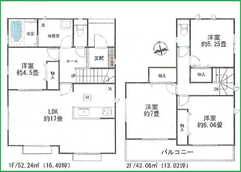 | 間取内容 | LDK17畳 1階 1室 洋室4.5畳 1階 1室 洋室5.25畳 2階 1室 洋室6.06畳 2階 1室 洋室7畳 2階 1室 | ||