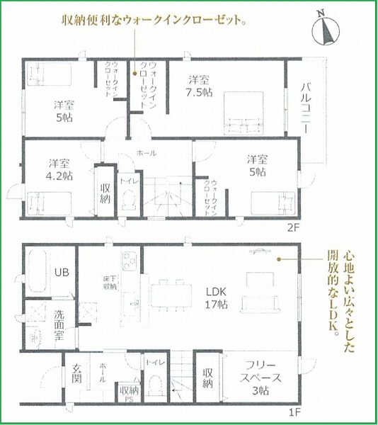 | 間取内容 | LDK17畳 1階 1室 洋室4.2畳 2階 1室 洋室5畳 2階 2室 洋室7.5畳 2階 1室 | ||