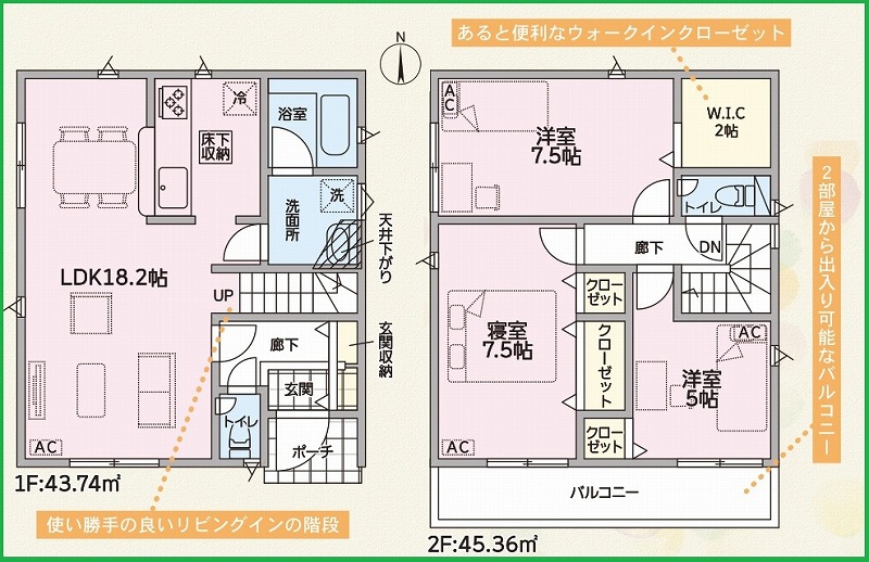| 間取内容 | LDK18.2畳 1階 1室 洋室5畳 2階 1室 洋室7.5畳 2階 2室 | ||